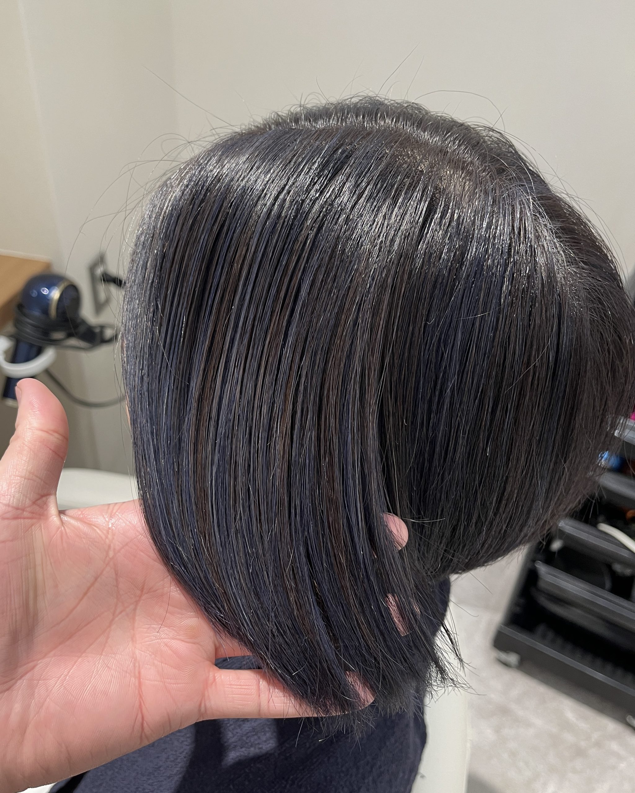 そして、今回は「ブルーな感じをさりげなく出したい」というご要望でしたので、鮮やかすぎない程度のブルーを、ネイビーの要素も入れて染めさせていただきました。